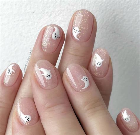 Transform your ghost nails into twinkling apparitions by adding shimmering embellishments. Use clear nail polish or a top coat to adhere small silver or iridescent sequins to the tips or bodies of the ghosts. The light will catch and reflect off the sequins, creating a subtle yet ethereal glow.