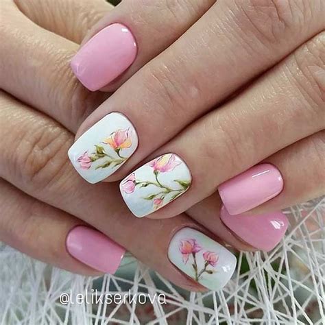 Light and pastel shades of pink, such as baby pink, blush, and peach, are popular choices for spring nail designs with flowers.